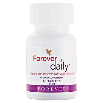 Αυτή η καθημερινή πολυβιταμίνη παρέχει το 100% της συνιστώμενης ημερήσιας δόσης (ΣΗΔ) βασικών βιταμινών και βιοδιαθέσιμων μετάλλων και θρεπτικών συστατικών. Το Forever Daily συνδυάζει πενήντα πέντε τέλεια ισορροπημένα θρεπτικά συστατικά με αλόη, συμπεριλαμβανομένων των βιταμινών A, C, D και B12, του σιδήρου, του ασβεστίου και του ψευδαργύρου. Μπορείτε να το λάβετε μαζί με το Χυμό Forever Aloe Vera Gel για καλύτερα αποτελέσματα.